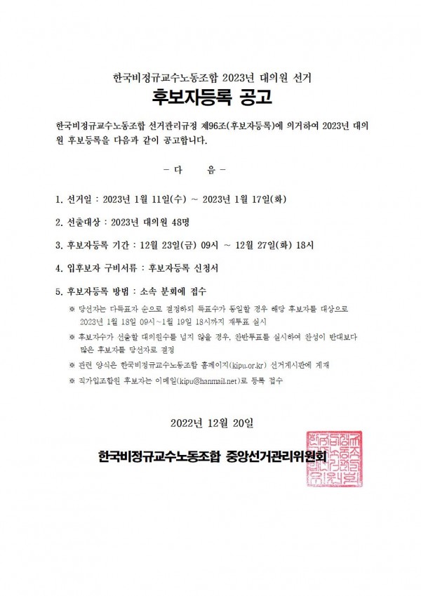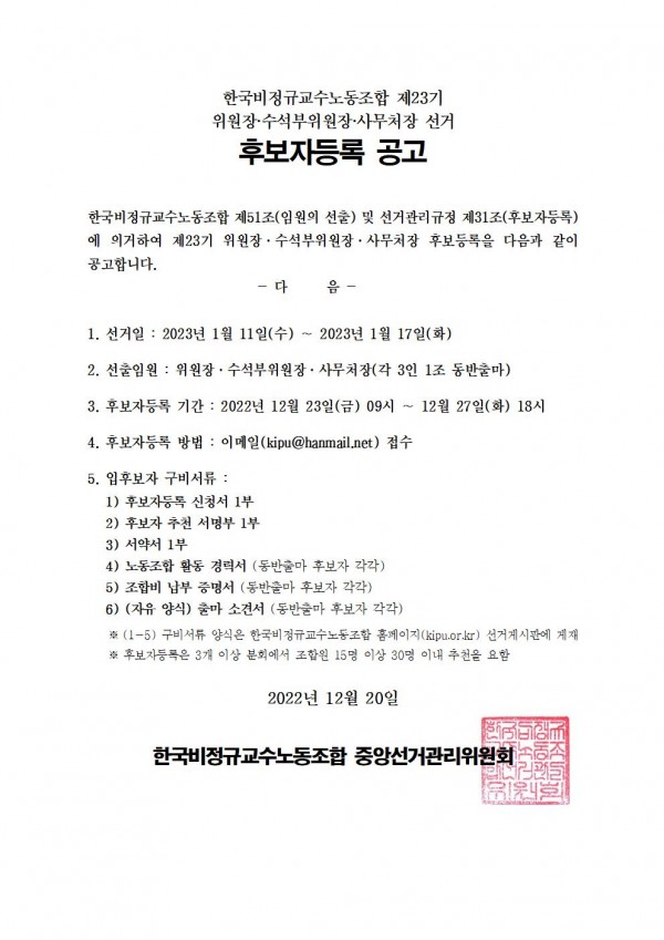 본조 임원 및 대의원 선거 후보자등록 공고