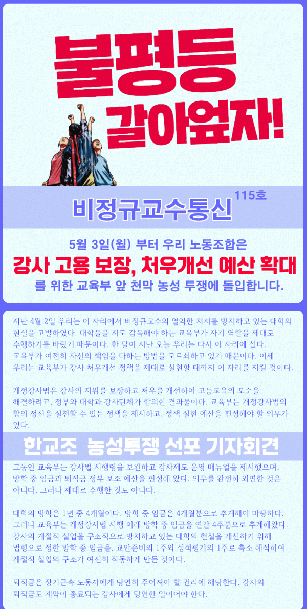 비정규교수통신 115호_ 강사 고용 보장, 처우 개선 예산 확대 요구 교육부 농성 돌입