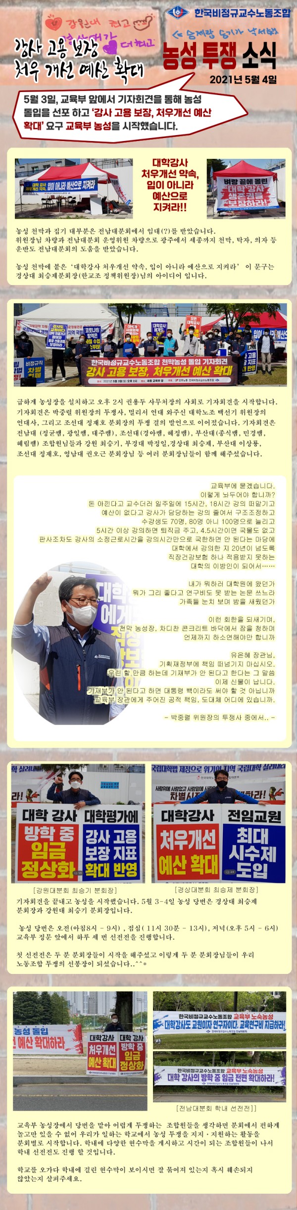 강사 고용 보장, 처우 개선 예산 확대_ 농성 소식1 페이지 정보 작성자 성균관대분회 작성일21-05-28 15:30 조회4,561회 댓글0건 이전글 다음글 목록 본문 강사 고용 보장, 처우 개선 예산 확대_ 농성 소식1 댓글목록 등록된 댓글이 없습니다. 이전글 다음글 목록